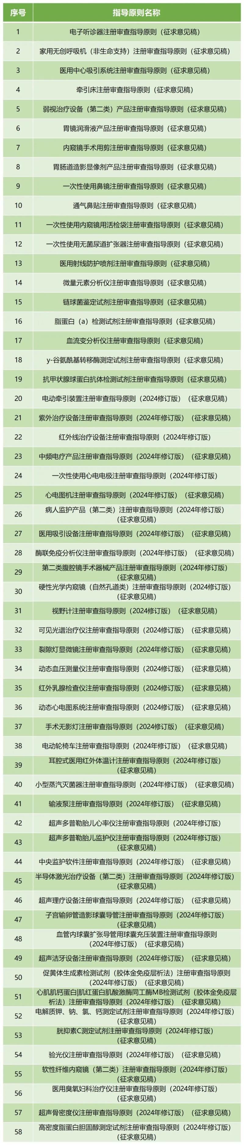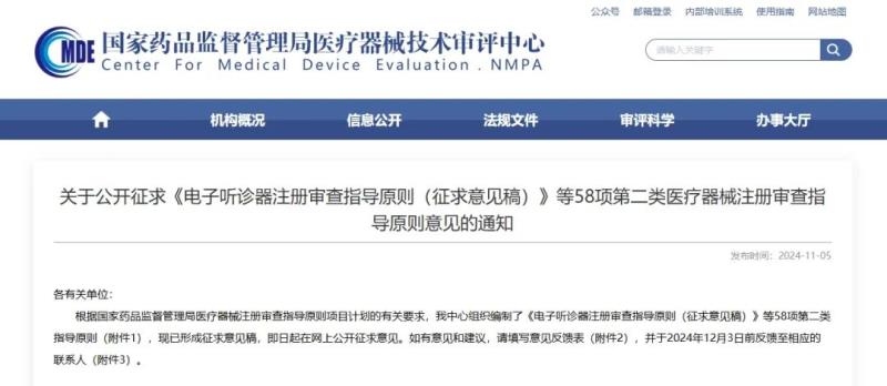11月5日,國家藥監(jiān)局器審中心發(fā)布《電子聽診器注冊審查指導(dǎo)原則(征求意見稿)》《弱視治療設(shè)備(第二類)產(chǎn)品注冊審查指導(dǎo)原則(征求意見稿)》《通氣鼻貼注冊審查指導(dǎo)原則(征求意見稿)》等58項(xiàng)第二類醫(yī)療器械注冊審查指導(dǎo)原則,并向社會(huì)公開征求意見,意見反饋時(shí)間:2024年12月3日前。我們通過查看附件中的指導(dǎo)原則名稱發(fā)現(xiàn),本次發(fā)布的指導(dǎo)原則中共有19項(xiàng)為新制定,其他均為2024年修訂版。具體清單如下: