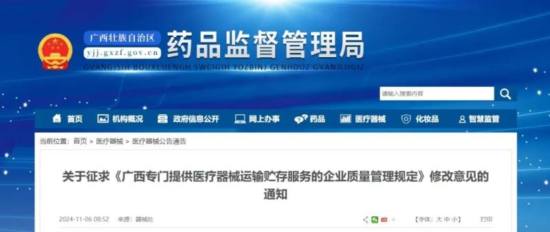 近日,廣西壯族自治區(qū)藥監(jiān)局發(fā)布《廣西專(zhuān)門(mén)提供醫(yī)療器械運(yùn)輸貯存服務(wù)的企業(yè)質(zhì)量管理規(guī)定》(以下簡(jiǎn)稱(chēng)《規(guī)定》),并向社會(huì)公開(kāi)征求意見(jiàn)。