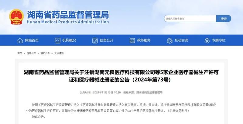 11月13日,湖南省藥監(jiān)局發(fā)布公告稱,按照《醫(yī)療器械監(jiān)督管理?xiàng)l例》《醫(yī)療器械生產(chǎn)監(jiān)督管理辦法》有關(guān)規(guī)定,根據(jù)企業(yè)申請(qǐng),現(xiàn)注銷湖南元良醫(yī)療科技有限公司等5家企業(yè)的醫(yī)療器械生產(chǎn)許可證;注銷長(zhǎng)沙市康博佳醫(yī)療用品有限公司、湖南省健緣醫(yī)療科技有限公司等11家企業(yè)的23個(gè)產(chǎn)品(以醫(yī)用口罩居多)的醫(yī)療器械注冊(cè)證,具體明細(xì)如下: