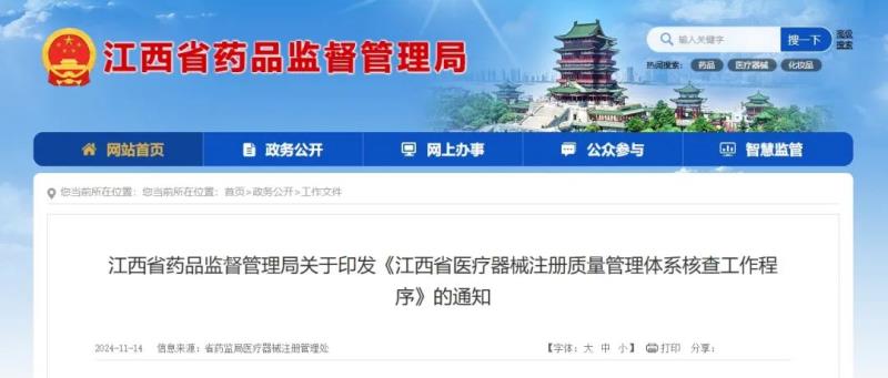11月14日,江西省藥監(jiān)局發(fā)布《江西省醫(yī)療器械注冊質(zhì)量管理體系核查工作程序》(以下簡稱《工作程序》),并指出,《江西省藥品監(jiān)督管理局關于印發(fā)〈江西省醫(yī)療器械注冊質(zhì)量管理體系核查工作程序〉的通知》(贛藥監(jiān)規(guī)〔2022〕12號)同時廢止。