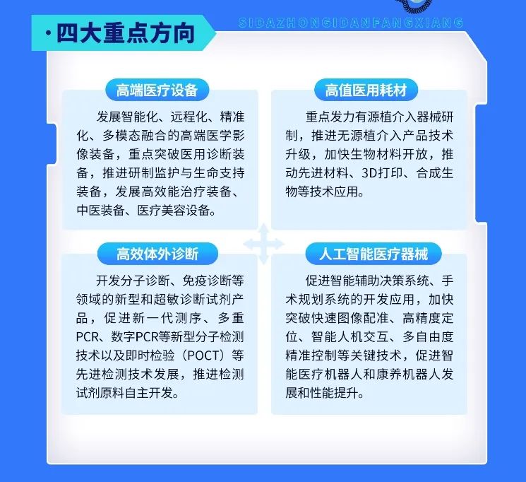 《行動(dòng)計(jì)劃》共提出了四大重點(diǎn)方向、六個(gè)重大工程、八大保障措施,按照“融合創(chuàng)新、醫(yī)產(chǎn)協(xié)同、聯(lián)動(dòng)發(fā)展、開(kāi)放合作”的基本原則,圍繞產(chǎn)業(yè)規(guī)模、創(chuàng)新效益、企業(yè)實(shí)力、產(chǎn)業(yè)生態(tài)四個(gè)維度,提出到2026年總體規(guī)模突破500億元、打造專業(yè)化產(chǎn)業(yè)園區(qū)5個(gè)以上、創(chuàng)新品種累計(jì)突破100個(gè)、力爭(zhēng)培育億元級(jí)新產(chǎn)品10個(gè)以上、新增一批國(guó)家級(jí)或市級(jí)創(chuàng)新載體、支持建設(shè)一批創(chuàng)新醫(yī)療器械示范應(yīng)用中心、培訓(xùn)中心、產(chǎn)教融合基地等具體目標(biāo),力爭(zhēng)到“十五五”末建成對(duì)標(biāo)世界一流水平的高端創(chuàng)新醫(yī)療器械產(chǎn)業(yè)集群。