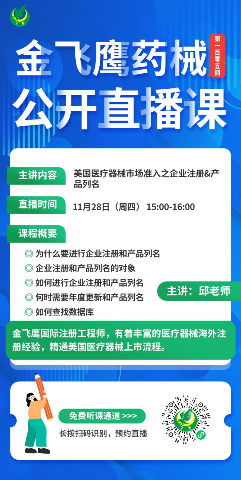 金飛鷹直播培訓(xùn)簡(jiǎn)介 金飛鷹直播培訓(xùn),是每周一次的固定培訓(xùn)欄目,優(yōu)選金飛鷹國(guó)內(nèi)外資深注冊(cè)/項(xiàng)目老師定期為大家講解醫(yī)療器械注冊(cè)相關(guān)知識(shí),解答大家在醫(yī)療器械注冊(cè)過(guò)程中的諸多疑問(wèn)。 此前我們已為大家?guī)?lái)新版醫(yī)療器械生物學(xué)評(píng)價(jià)標(biāo)準(zhǔn)、新版醫(yī)療器械風(fēng)險(xiǎn)管理標(biāo)準(zhǔn)、醫(yī)療器械軟件注冊(cè)、新版醫(yī)療器械經(jīng)營(yíng)質(zhì)量管理規(guī)范等共計(jì)104次線上培訓(xùn)課程,有興趣的可點(diǎn)擊視頻號(hào)直播回放進(jìn)行查看~另外大家也一定很關(guān)注接下來(lái)的培訓(xùn)主題,相關(guān)培訓(xùn)預(yù)告我們會(huì)陸續(xù)添加至視頻號(hào),請(qǐng)大家持續(xù)關(guān)注哦!