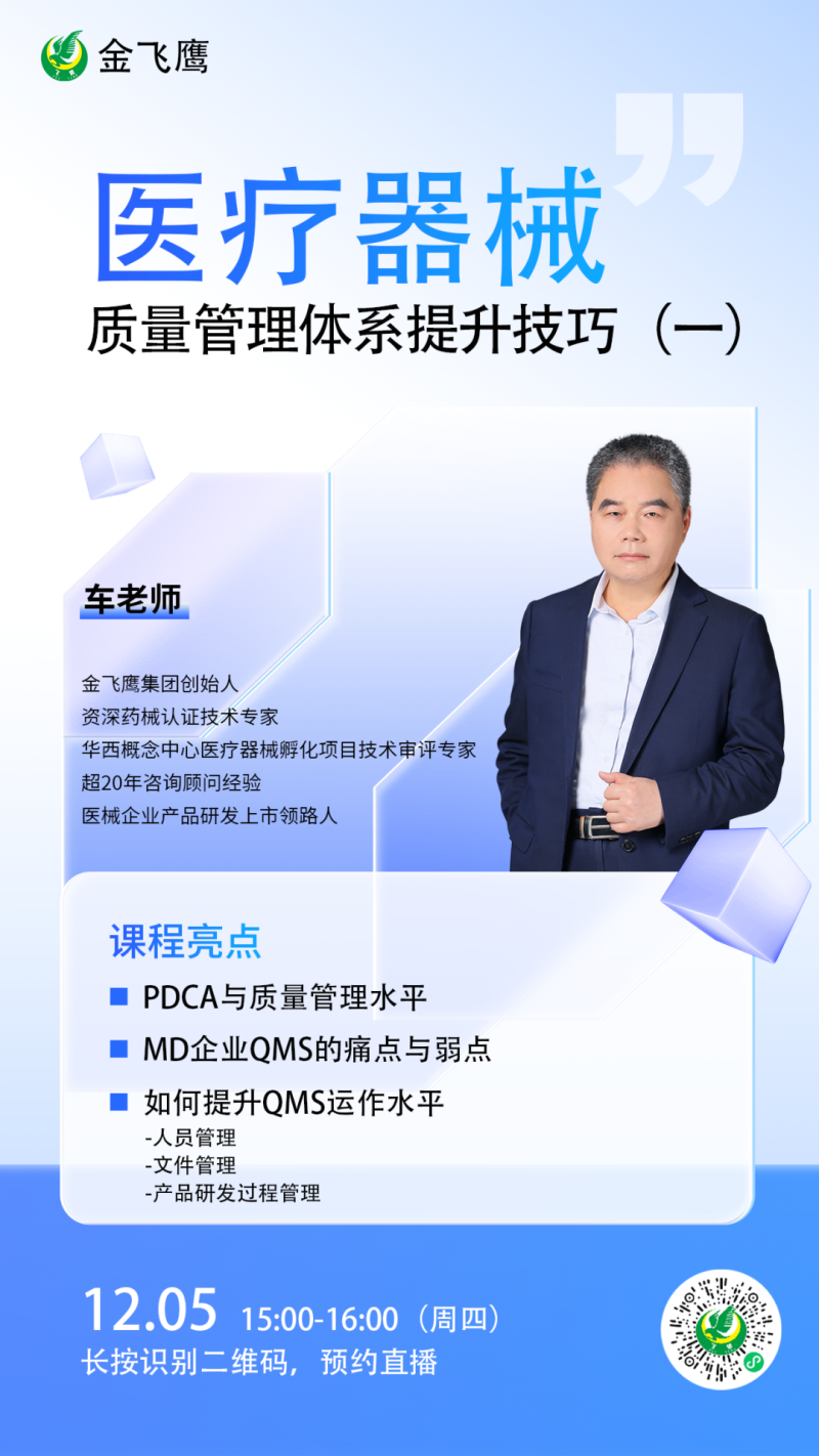 12月5日下午3點(diǎn),金飛鷹集團(tuán)創(chuàng)始人車號(hào)爽老師給大家?guī)怼夺t(yī)療器械質(zhì)量管理體系提升技巧(一),培訓(xùn)內(nèi)容包括PDCA與質(zhì)量管理水平、MD企業(yè)QMS的痛點(diǎn)與弱點(diǎn)以及本次課題的重點(diǎn)——如何提升QMS運(yùn)作水平的前半部分想聽課的朋友記得提前預(yù)約!