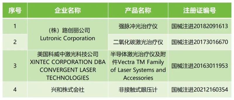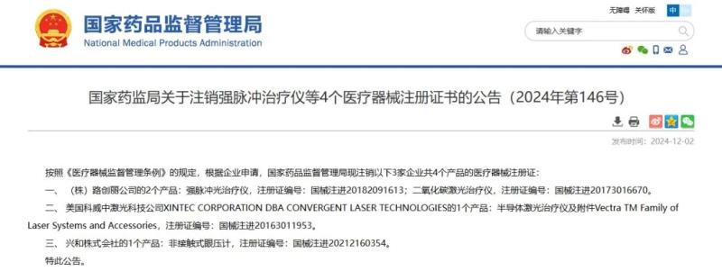 12月2日,國家藥監(jiān)局發(fā)布一則醫(yī)療器械注冊證注銷公告,公告顯示,局已依法注銷(株)路創(chuàng)麗公司Lutronic Corporation、興和株式會社等3家境外企業(yè)共計4個產(chǎn)品的醫(yī)療器械注冊證,包括強脈沖光治療儀、二氧化碳激光治療儀等,均為進口產(chǎn)品,具體明細(xì)如下: