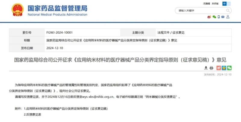 12月10日,國家藥監(jiān)局發(fā)布《應(yīng)用納米材料的醫(yī)療器械產(chǎn)品分類界定指導(dǎo)原則(征求意見稿)》(以下簡稱《指導(dǎo)原則》),并向社會(huì)公開征求意見。