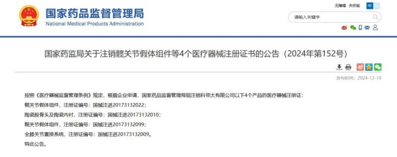 12月19日,國(guó)家藥監(jiān)局發(fā)布一則醫(yī)療器械注冊(cè)證注銷(xiāo)公告,公告顯示,局已依法注銷(xiāo)國(guó)科鄰太有限公司4個(gè)Ⅲ類(lèi)產(chǎn)品的醫(yī)療器械注冊(cè)證,具體如下:
