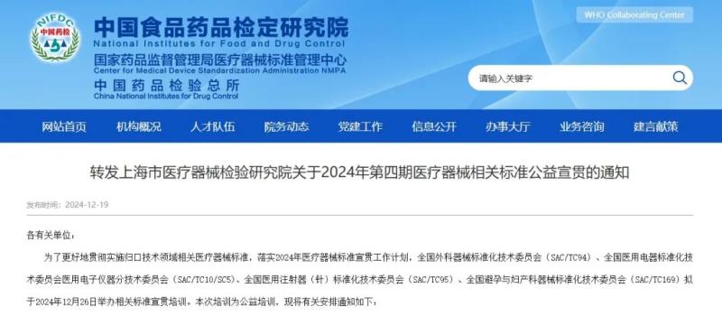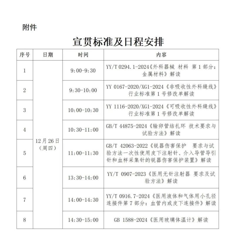 近日,國家藥監(jiān)局醫(yī)療器械標(biāo)準(zhǔn)管理中心轉(zhuǎn)發(fā)了《上海市醫(yī)療器械檢驗研究院關(guān)于2024年第四期醫(yī)療器械相關(guān)標(biāo)準(zhǔn)公益宣貫的通知》,其中提到,全國外科器械標(biāo)準(zhǔn)化技術(shù)委員會(SAC/TC94)、全國醫(yī)用電器標(biāo)準(zhǔn)化技術(shù)委員會醫(yī)用電子儀器分技術(shù)委員會(SAC/TC10/SC5)、全國醫(yī)用注射器(針)標(biāo)準(zhǔn)化技術(shù)委員會(SAC/TC95)、全國避孕與婦產(chǎn)科器械標(biāo)準(zhǔn)化技術(shù)委員會(SAC/TC169)擬于2024年12月26日舉辦相關(guān)標(biāo)準(zhǔn)宣貫培訓(xùn),培訓(xùn)內(nèi)容為YY/T 0907-2023《醫(yī)用無針注射器要求及驗方法》8項標(biāo)準(zhǔn)解讀,具體如下: