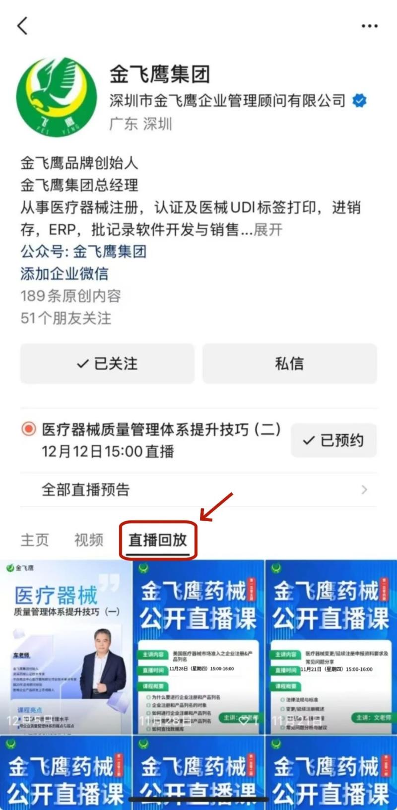 往期直播培訓(xùn)課程支持回放,關(guān)注“金飛鷹藥械咨詢(xún)服務(wù)”視頻號(hào)并點(diǎn)擊視頻號(hào)主頁(yè),即可查看“直播回放”哦~