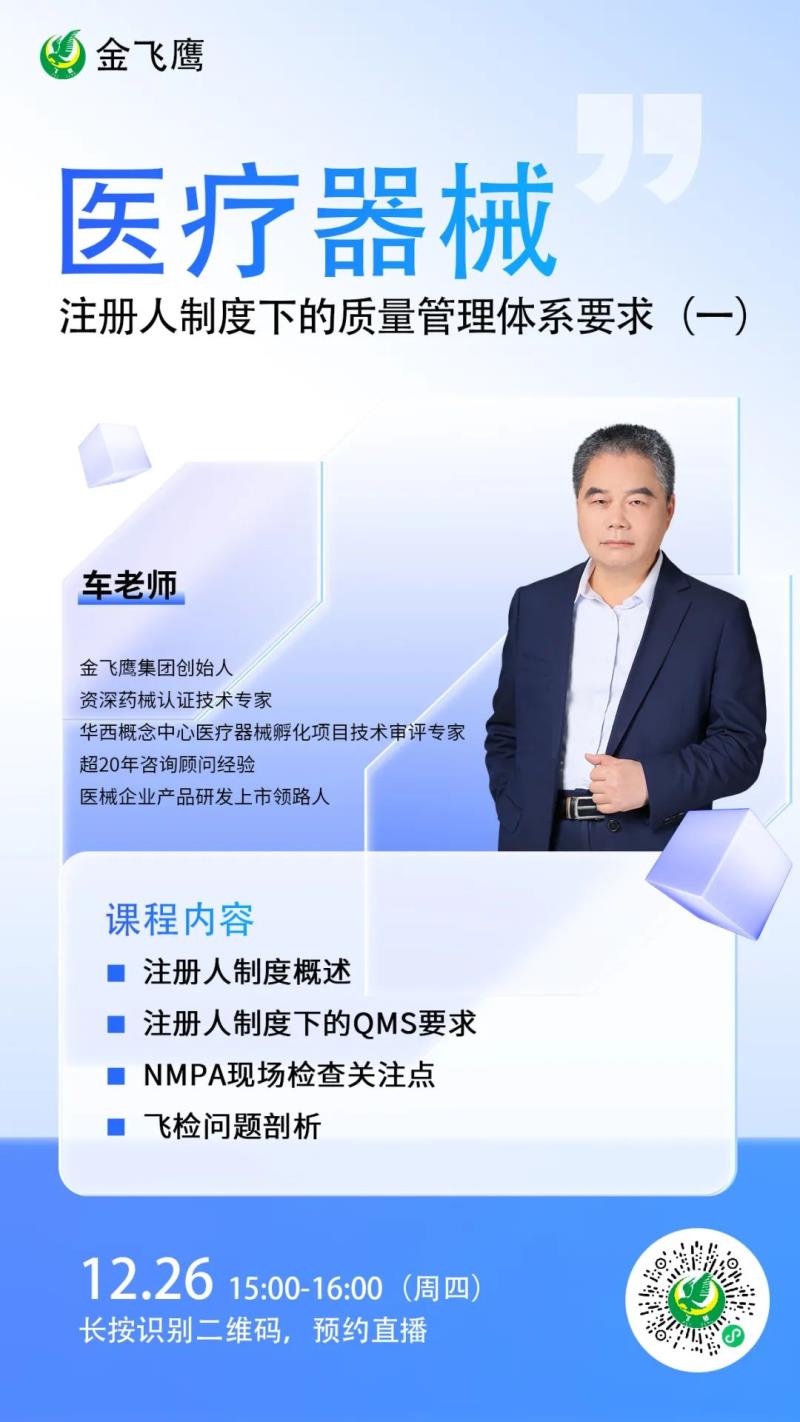 金飛鷹直播培訓(xùn),是每周一次的固定培訓(xùn)欄目,優(yōu)選金飛鷹國(guó)內(nèi)外資深注冊(cè)/項(xiàng)目老師定期為大家講解醫(yī)療器械注冊(cè)相關(guān)知識(shí),解答大家在醫(yī)療器械注冊(cè)過(guò)程中的諸多疑問(wèn)。