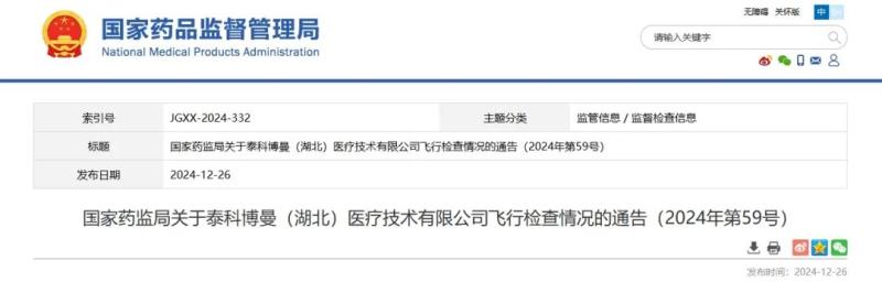 12月26日,國(guó)家藥監(jiān)局發(fā)布通告稱,該局組織檢查組對(duì)**(湖北)醫(yī)療技術(shù)有限公司進(jìn)行飛行檢查,發(fā)現(xiàn)該企業(yè)質(zhì)量管理體系主要存在以下缺陷: