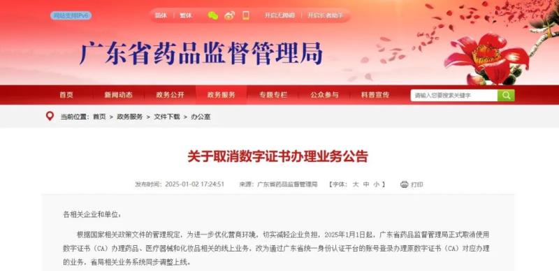 廣東藥監(jiān)局:正式取消使用數字證書(CA)辦理線上業(yè)務