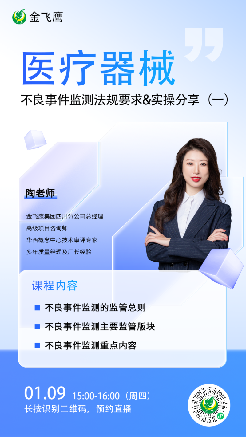 金飛鷹直播培訓(xùn)簡介 金飛鷹直播培訓(xùn),是每周一次的固定培訓(xùn)欄目,優(yōu)選金飛鷹國內(nèi)外資深注冊/項目老師定期為大家講解醫(yī)療器械注冊相關(guān)知識,解答大家在醫(yī)療器械注冊過程中的諸多疑問。 此前我們已為大家?guī)硇掳驷t(yī)療器械生物學評價標準、新版醫(yī)療器械風險管理標準、醫(yī)療器械軟件注冊、醫(yī)療器械質(zhì)量管理體系提升技巧等共計110次線上培訓(xùn)課程,有興趣的可點擊視頻號直播回放進行查看~另外大家也一定很關(guān)注接下來的培訓(xùn)主題,相關(guān)培訓(xùn)預(yù)告我們會陸續(xù)添加至視頻號,請大家持續(xù)關(guān)注哦!