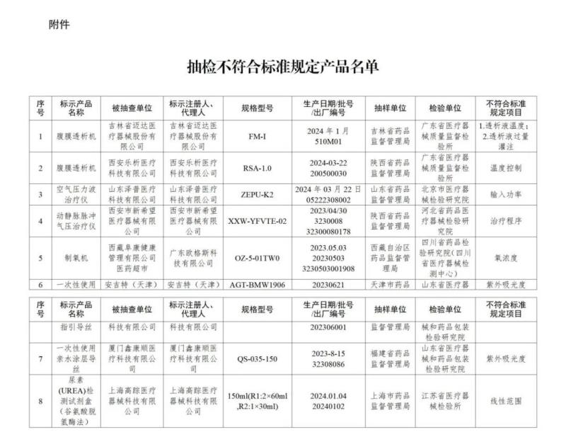 1月7日,國家藥品監(jiān)管局發(fā)布《國家醫(yī)療器械監(jiān)督抽檢結(jié)果的通告(2025年第2號)》,此次共檢出8批(臺)不合格產(chǎn)品,涉及:吉林省邁達醫(yī)療器械股份有限公司生產(chǎn)的腹膜透析設(shè)備山東澤普醫(yī)療科技有限公司生產(chǎn)的肢體加壓理療設(shè)備、廣東歐格斯科技有限公司生產(chǎn)的醫(yī)用分子篩制氧機等產(chǎn)品,具體情況如下: