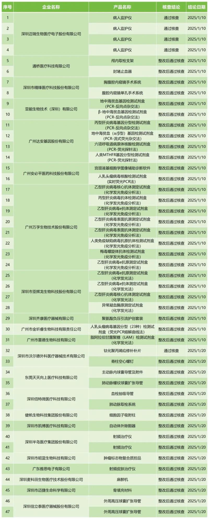 2月12日,廣東省藥監(jiān)局官網(wǎng)公布2025年1月醫(yī)療器械注冊質量管理體系核查結果,包括深圳邁瑞生物醫(yī)療電子股份有限公司的四款病人監(jiān)護儀、深圳半島醫(yī)療集團股份有限公司的兩款射頻治療儀、廣東雅思電子有限公司射頻皮膚治療儀共計47款產(chǎn)品,其中有五款產(chǎn)品核查結論為“通過核查”,其余均為“整改后通過核查”。具體明細見下方表格: