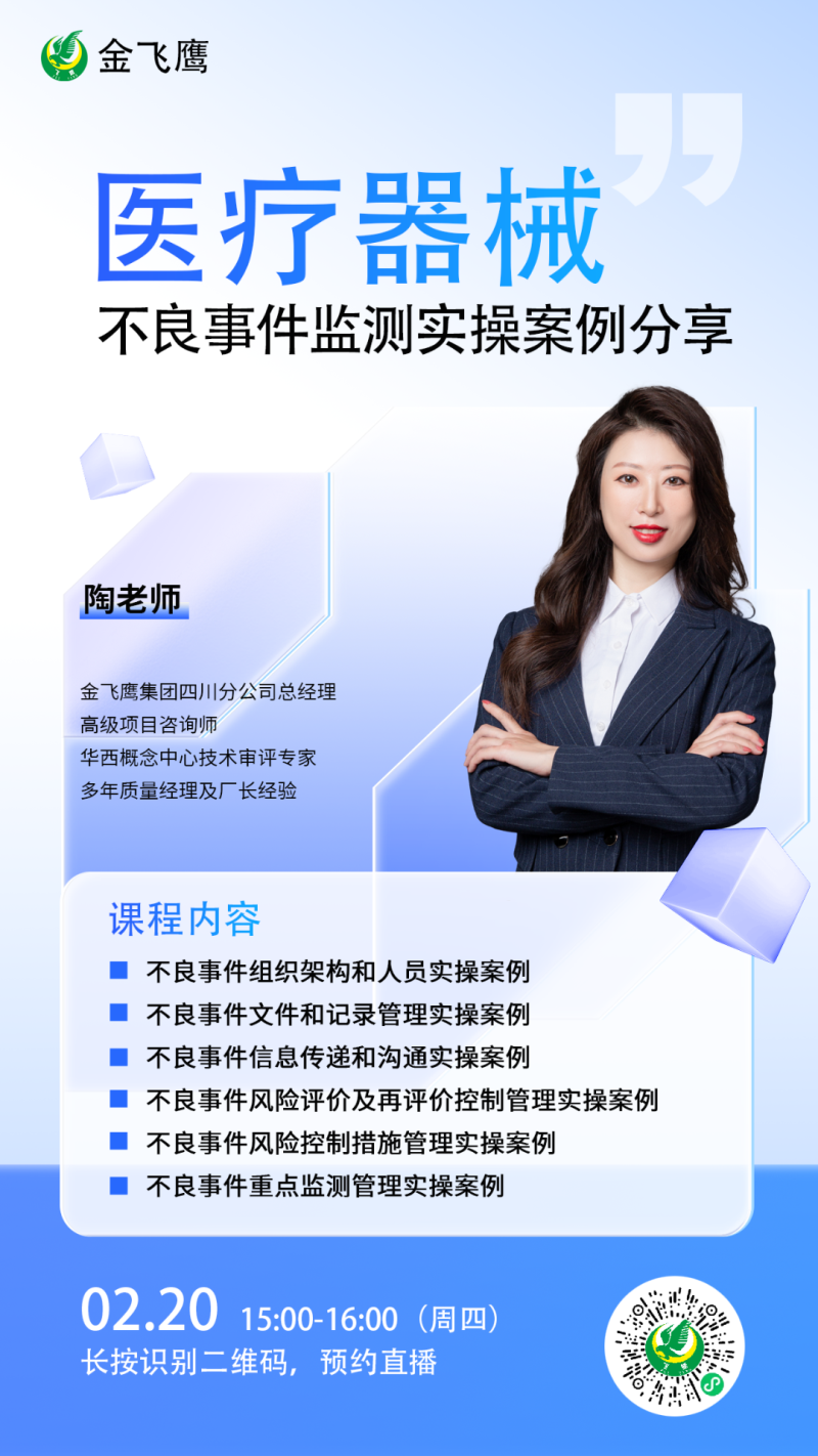 金飛鷹直播培訓(xùn)簡介 金飛鷹直播培訓(xùn),是每周一次的固定培訓(xùn)欄目,優(yōu)選金飛鷹國內(nèi)外資深注冊/項目老師定期為大家講解醫(yī)療器械注冊相關(guān)知識,解答大家在醫(yī)療器械注冊過程中的諸多疑問。 此前我們已為大家?guī)硇掳驷t(yī)療器械生物學(xué)評價標(biāo)準(zhǔn)、新版醫(yī)療器械風(fēng)險管理標(biāo)準(zhǔn)、醫(yī)療器械軟件注冊、醫(yī)療器械質(zhì)量管理體系提升技巧等共計111次線上培訓(xùn)課程,有興趣的可點擊視頻號直播回放進(jìn)行查看~另外大家也一定很關(guān)注接下來的培訓(xùn)主題,相關(guān)培訓(xùn)預(yù)告我們會陸續(xù)添加至視頻號,請大家持續(xù)關(guān)注哦!