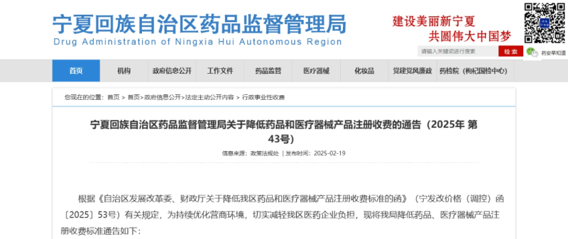 2月19日,寧夏回族自治區(qū)藥監(jiān)局發(fā)布《關(guān)于降低藥品和醫(yī)療器械產(chǎn)品注冊收費(fèi)的通告(2025年 第43號)》,大幅降低藥品和醫(yī)療器械產(chǎn)品注冊收費(fèi)標(biāo)準(zhǔn)。具體內(nèi)容如下: