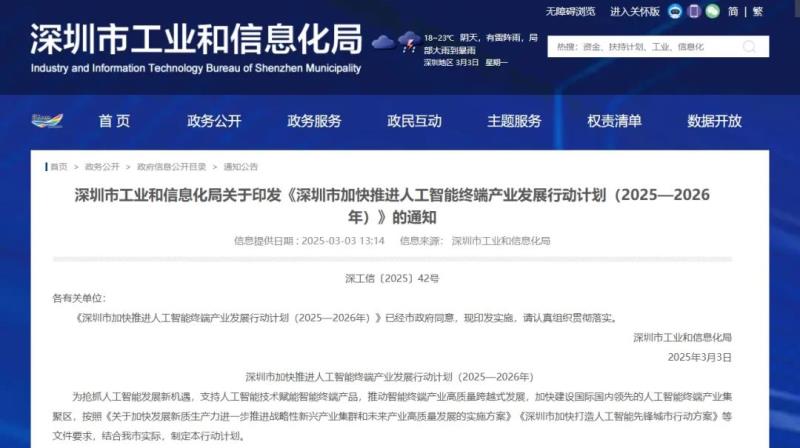 3月3日,深圳市工業(yè)和信息化局發(fā)布《深圳市加快打造人工智能先鋒城市行動計劃(2025—2026年)》(以下簡稱《行動計劃》),以搶抓人工智能發(fā)展新機遇,支持人工智能技術(shù)賦能智能終端產(chǎn)品,推動智能終端產(chǎn)業(yè)高質(zhì)量跨越式發(fā)展,加快建設(shè)國際國內(nèi)領(lǐng)先的人工智能終端產(chǎn)業(yè)集聚區(qū)。