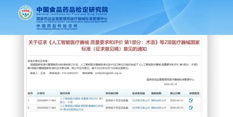 3月14日,國(guó)家藥監(jiān)局醫(yī)療器械標(biāo)準(zhǔn)管理中心發(fā)布《人工智能醫(yī)療器械 質(zhì)量要求和評(píng)價(jià) 第1部分:術(shù)語(yǔ)》《人工智能醫(yī)療器械 肺部影像輔助分析軟件 算法性能測(cè)試方法》2項(xiàng)醫(yī)療器械國(guó)家標(biāo)準(zhǔn)的征求意見稿,并向社會(huì)公開征求意見。