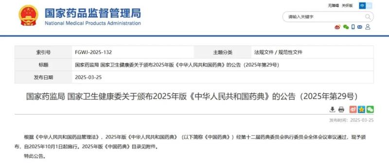 3月25日,國(guó)家藥監(jiān)局、國(guó)家衛(wèi)生健康委頒布2025年版《中華人民共和國(guó)藥典》,并宣布自2025年10月1日起實(shí)施。與此同時(shí),國(guó)家藥監(jiān)局對(duì)實(shí)施新版《中國(guó)藥典》有關(guān)事宜公告如下: