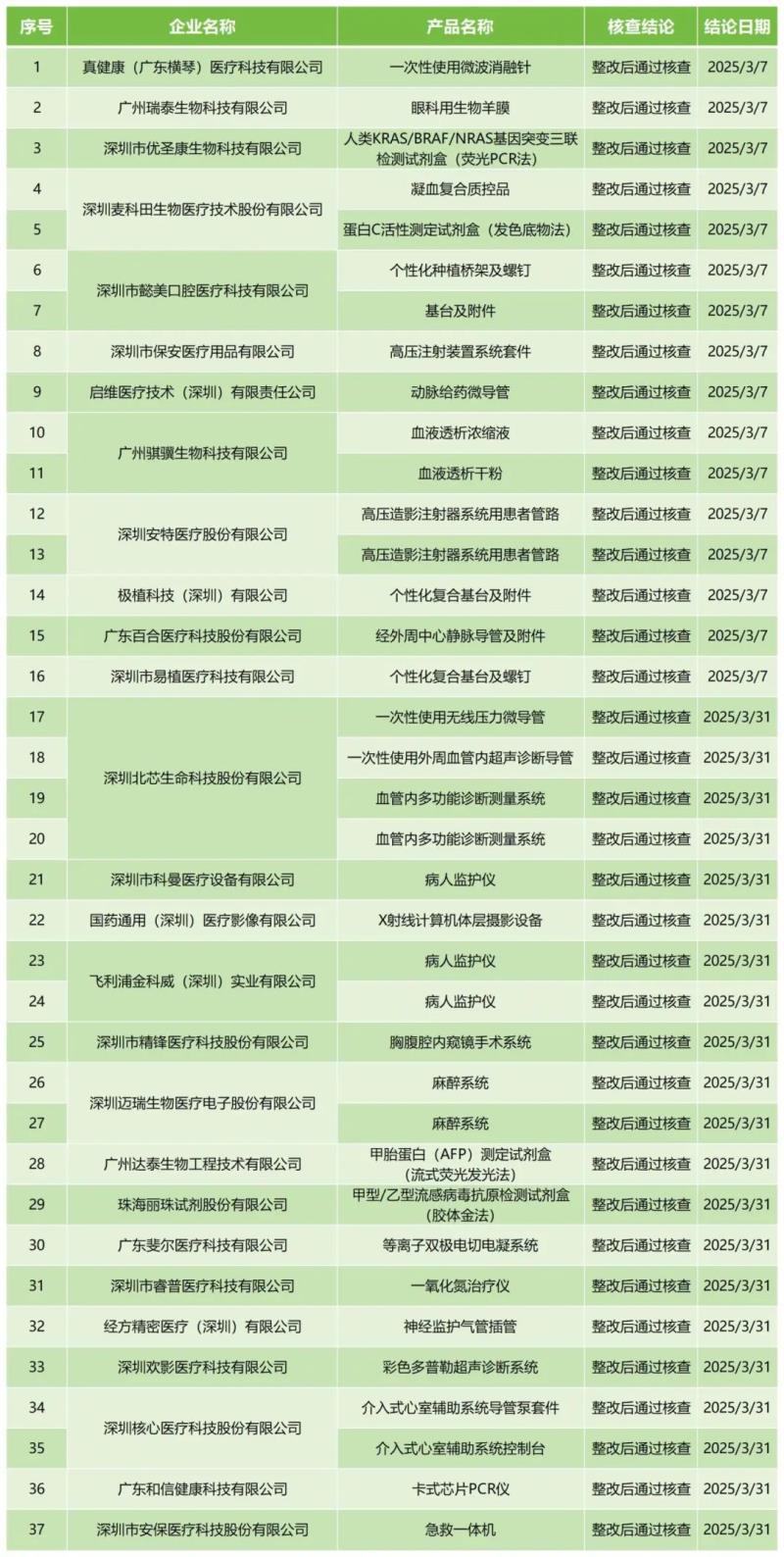 4月10日,廣東省藥監(jiān)局官網(wǎng)公布2025年3月醫(yī)療器械注冊(cè)質(zhì)量管理體系核查結(jié)果,包括真健康(廣東橫琴)醫(yī)療科技有限公司的一次性使用微波消融針、深圳市科曼醫(yī)療設(shè)備有限公司的病人監(jiān)護(hù)儀、深圳市精鋒醫(yī)療科技股份有限公司的胸腹腔內(nèi)窺鏡手術(shù)系統(tǒng)、深圳邁瑞生物醫(yī)療電子股份有限公司的麻醉系統(tǒng)等共計(jì)37款產(chǎn)品,均為“整改后通過核查”。具體明細(xì)見下方表格: