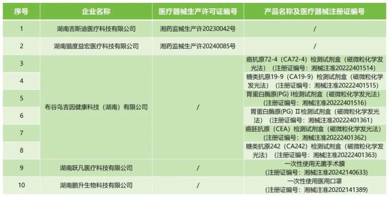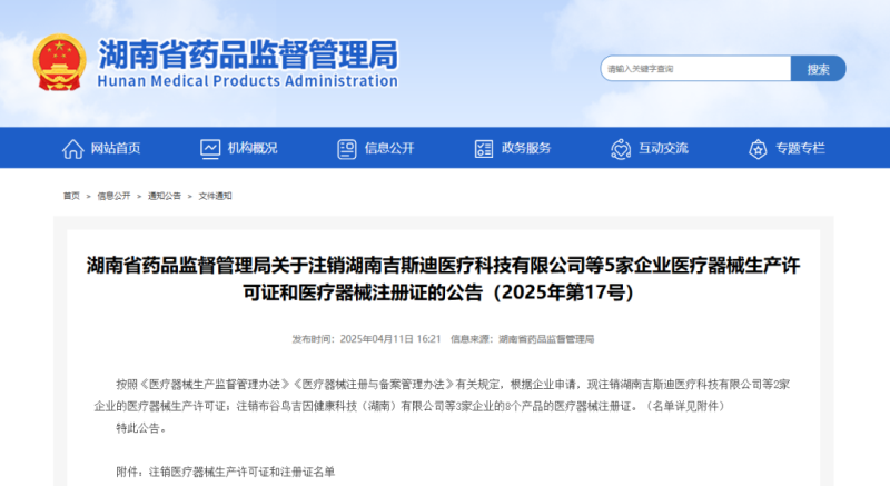 4月11日,湖南省藥監(jiān)局發(fā)布公告稱,按照《醫(yī)療器械監(jiān)督管理?xiàng)l例》《醫(yī)療器械生產(chǎn)監(jiān)督管理辦法》有關(guān)規(guī)定,根據(jù)企業(yè)申請,現(xiàn)注銷湖南吉斯迪醫(yī)療科技有限公司等2家企業(yè)的醫(yī)療器械生產(chǎn)許可證;注銷布谷鳥吉因健康科技(湖南)有限公司、湖南躍凡醫(yī)療科技有限公司等3家企業(yè)的8個產(chǎn)品的醫(yī)療器械注冊證,具體明細(xì)如下: