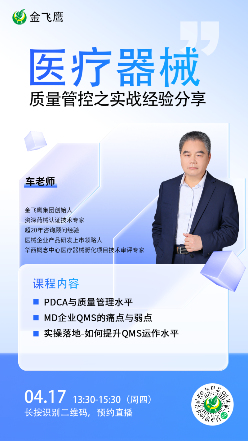 在此背景下,由金飛鷹、成都聯(lián)東U谷聯(lián)合主辦,成都高新區(qū)醫(yī)療器械創(chuàng)新轉(zhuǎn)化協(xié)會(huì)動(dòng)脈網(wǎng)、成都數(shù)智醫(yī)療創(chuàng)新聯(lián)盟協(xié)會(huì)協(xié)辦的醫(yī)療器械質(zhì)量管理與注冊(cè)申報(bào)實(shí)操經(jīng)驗(yàn)分享的線下培訓(xùn),將于4月17日下午在成都溫江區(qū)聯(lián)東U谷·成都醫(yī)學(xué)城科技企業(yè)港30棟黨建活動(dòng)中心舉辦。本次培訓(xùn)聚焦“醫(yī)療器械質(zhì)量工作日常管理技巧實(shí)操經(jīng)驗(yàn)專題”和“醫(yī)療器械注冊(cè)申報(bào)技巧實(shí)操經(jīng)驗(yàn)專題”兩大熱門主題,由金飛鷹集團(tuán)創(chuàng)始人車號(hào)爽老師主導(dǎo)進(jìn)行分享,他將結(jié)合金飛鷹輔導(dǎo)過(guò)的眾多成功案例,深入剖析醫(yī)療器械質(zhì)量工作日常管理的實(shí)用技巧,為企業(yè)提供可落地的專業(yè)指導(dǎo),提升企業(yè)的市場(chǎng)競(jìng)爭(zhēng)力!