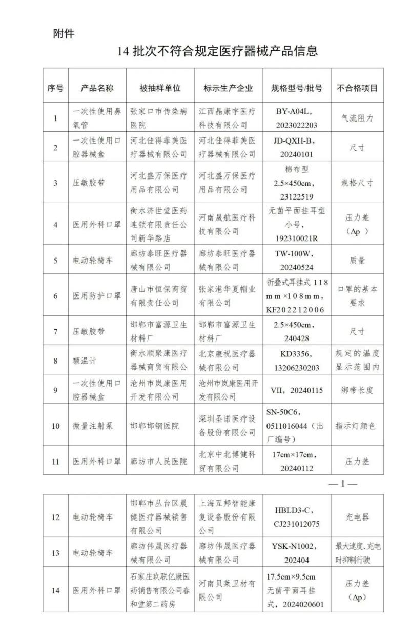 近日,河北省藥監(jiān)局發(fā)布《全省醫(yī)療器械監(jiān)督抽檢結(jié)果的公告(2025年第一期)》,其中提到,該局組織對(duì)2024年全省生產(chǎn)、經(jīng)營(yíng)和使用等環(huán)節(jié)醫(yī)療器械進(jìn)行了質(zhì)量監(jiān)督抽檢,共發(fā)現(xiàn)14批次產(chǎn)品不符合標(biāo)準(zhǔn)規(guī)定,包括一次性使用鼻氧管、醫(yī)用外科口罩、電動(dòng)輪椅車、微量注射泵等,具體明細(xì)如下: