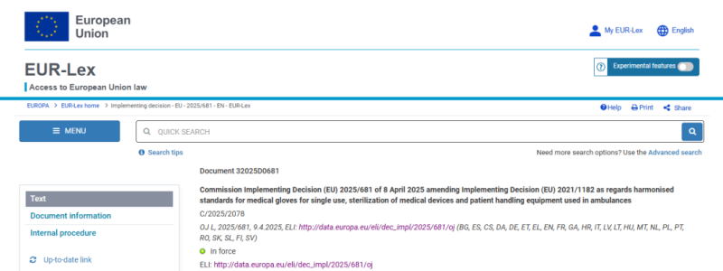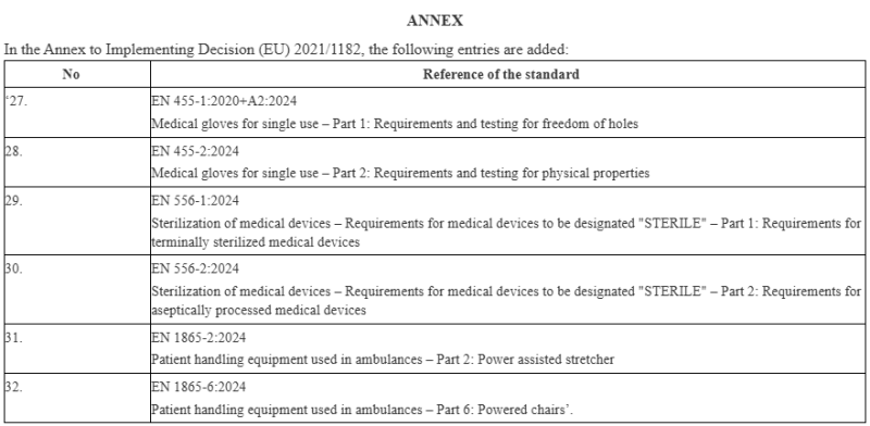 近日,歐盟委員會(huì)發(fā)布公告稱,根據(jù)2025 年 4 月 8 日歐盟委員會(huì)第 2025/681 號實(shí)施決定,修訂了關(guān)于一次性醫(yī)用手套的協(xié)調(diào)標(biāo)準(zhǔn) EN 455-1:2020 和 EN 455-2:2015、關(guān)于醫(yī)療器械滅菌的協(xié)調(diào)標(biāo)準(zhǔn) EN 556-1:2001《醫(yī)療器械滅菌-標(biāo)記為“無菌”的醫(yī)療器械的要求-第 1 部分:最終滅菌醫(yī)療器械的要求》和 EN 556-2:2015《醫(yī)療器械滅菌-標(biāo)記為“無菌”的醫(yī)療器械的要求-第 2 部分:無菌加工醫(yī)療器械的要求》,以及關(guān)于救護(hù)車使用的患者處理設(shè)備的 EN 1865-2:2010+A1:2015,并起草了關(guān)于救護(hù)車使用的患者處理設(shè)備的協(xié)調(diào)標(biāo)準(zhǔn) EN 1865-6,具體明細(xì)如下: