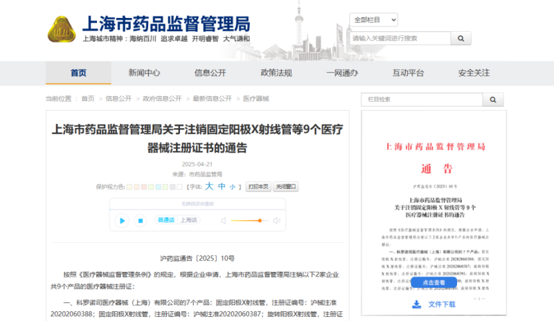 4月21日,上海市藥監(jiān)局發(fā)布通告稱,按照《醫(yī)療器械監(jiān)督管理條例》的規(guī)定,根據(jù)企業(yè)申請,該局已注銷科羅諾司醫(yī)療器械(上海)有限公司等2家企業(yè)共9個產(chǎn)品的醫(yī)療器械注冊證,包括固定陽極X射線管、數(shù)字中功率耳背式助聽器等,具體明細如下: