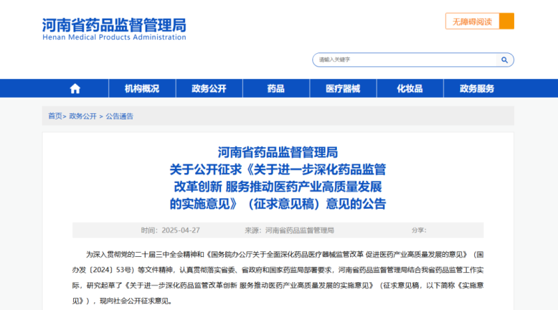 4月27日,河南省藥監(jiān)局發(fā)布《關(guān)于進(jìn)一步深化藥品監(jiān)管改革創(chuàng)新 服務(wù)推動醫(yī)藥產(chǎn)業(yè)高質(zhì)量發(fā)展的實施意見(征求意見稿)》,以下簡稱《實施意見》),并向社會公開征求意見。