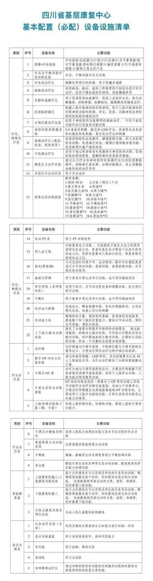 這些康復(fù)中心的建設(shè)無疑需要配置很多設(shè)備設(shè)施,其中《方案》中提到的基層康復(fù)中心必備的基本配置設(shè)備設(shè)施清單如下: