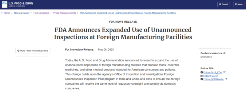 據(jù)FDA所述,長期以來,海外企業(yè)在美國FDA的檢查中享受“提前通知”的特權(quán),而美國本土企業(yè)則需接受嚴格的無預(yù)警檢查。這種雙重標準使得海外企業(yè)有時間準備,掩蓋問題,損害了監(jiān)管的公正性與有效性。