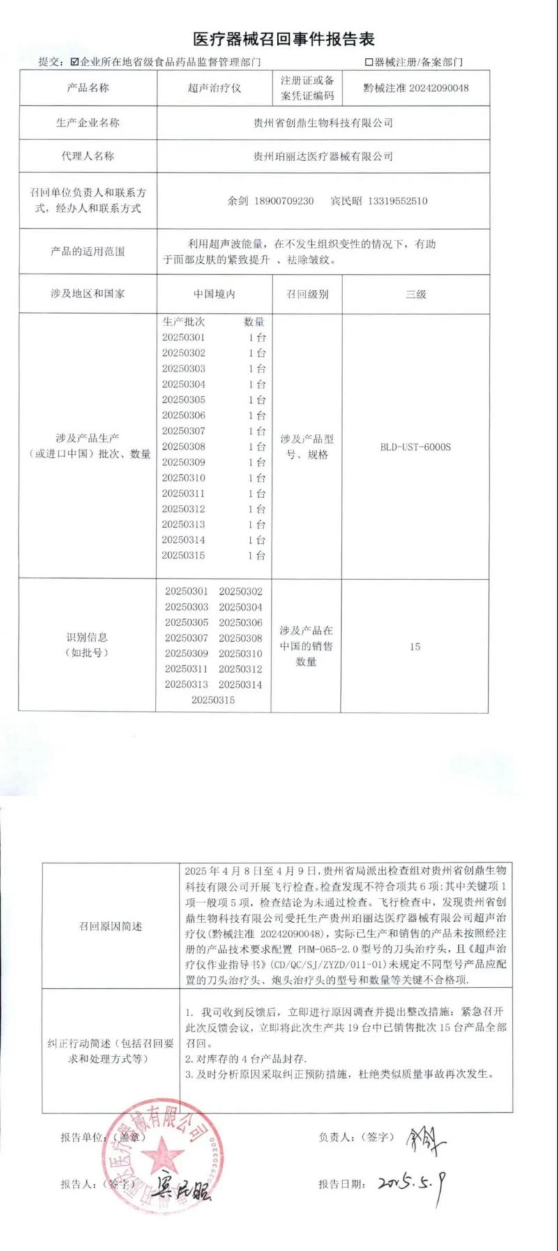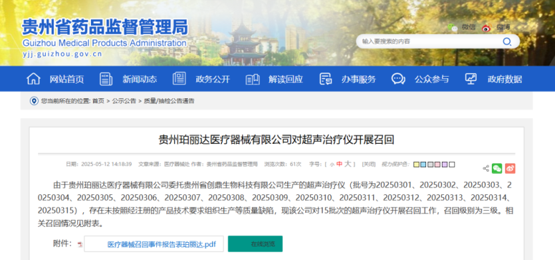 5月12日,貴州省藥監(jiān)局發(fā)布一則召回公告,其中提到,由于貴州珀麗達醫(yī)療器械有限公司委托貴州省創(chuàng)鼎生物科技有限公司生產(chǎn)的超聲治療儀(產(chǎn)品適用范圍:利用超聲波能量,在不發(fā)生組織變性的情況下,有助于面部皮膚的緊致提升、祛除皺紋),存在未按照經(jīng)注冊的產(chǎn)品技術要求組織生產(chǎn)等質(zhì)量缺陷,現(xiàn)該公司對15批次的超聲治療儀開展召回工作,召回級別為三級。具體召回情況如下: