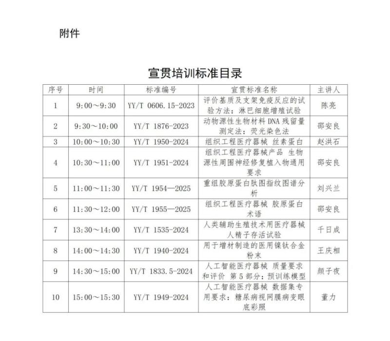 對YY/T 0606.15-2023《評價基質(zhì)及支架免疫反應的試驗方法:淋巴細胞增殖試驗》、YY/T 1955-2025《組織工程醫(yī)療器械 膠原蛋白術語》、YY/T 1833.5-2024《人工智能醫(yī)療器械 質(zhì)量要求和評價 第5部分:預訓練模型》等10項行業(yè)標準進行宣貫培訓,具體清單及安排如下: