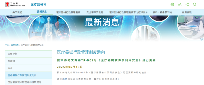 香港更新《醫(yī)療器械軟件及網(wǎng)絡(luò)安全》技術(shù)參考文件