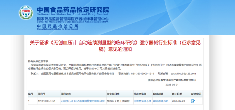 有關(guān)無(wú)創(chuàng)血壓計(jì)臨床研究的行業(yè)標(biāo)準(zhǔn)征求意見(jiàn)中