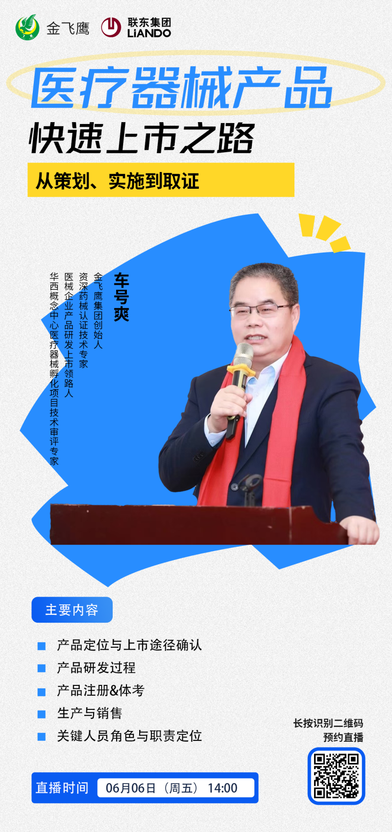 今年4月,金飛鷹與成都聯(lián)東U谷聯(lián)合主辦了一場(chǎng)線下培訓(xùn),得到了園區(qū)企業(yè)的一致好評(píng)。基于前期良好的合作基礎(chǔ),金飛鷹與聯(lián)東U谷產(chǎn)業(yè)園區(qū)的合作進(jìn)一步深化升級(jí)。6月6日,我們將面向全國(guó)聯(lián)東U谷產(chǎn)業(yè)園區(qū)的醫(yī)療器械企業(yè),開展“醫(yī)療器械產(chǎn)品快速上市之路線上專題培訓(xùn)由集團(tuán)創(chuàng)始人車號(hào)爽老師進(jìn)行分享,并通過“金飛鷹集團(tuán)”視頻號(hào)同步直播。車?yán)蠋煂⒔Y(jié)合金飛鷹18年來積累的4000+成功案例,為企業(yè)提供可落地執(zhí)行的實(shí)操指導(dǎo),幫助企業(yè)優(yōu)化注冊(cè)申報(bào)流程,縮短產(chǎn)品上市周期,提升市場(chǎng)競(jìng)爭(zhēng)力。