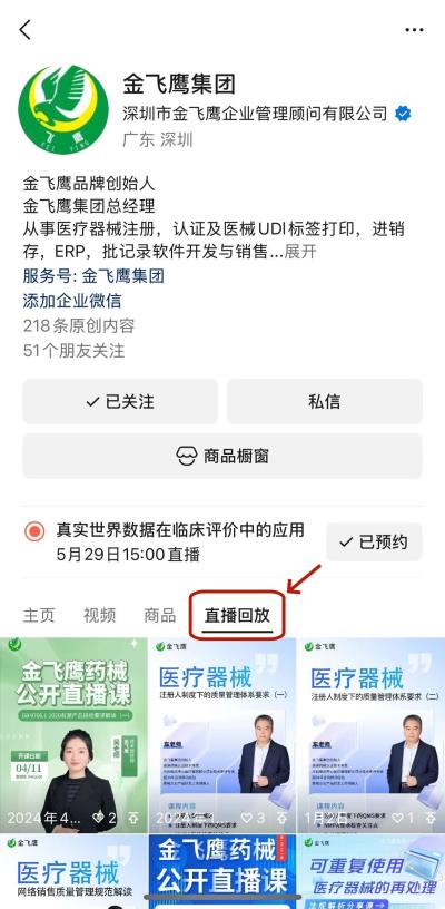 往期直播培訓(xùn)課程支持回放,關(guān)注“金飛鷹藥械咨詢服務(wù)”視頻號(hào)并點(diǎn)擊視頻號(hào)主頁(yè),即可查看“直播回放”哦~