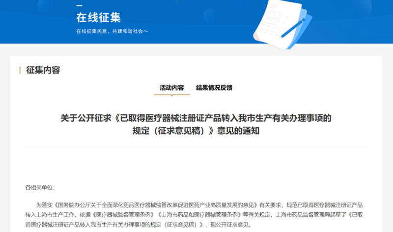 近日,上海市藥監(jiān)局發(fā)布《已取得醫(yī)療器械注冊(cè)證產(chǎn)品轉(zhuǎn)入我市生產(chǎn)有關(guān)辦理事項(xiàng)的規(guī)定》(以下簡(jiǎn)稱《規(guī)定》),并向社會(huì)公開征求意見。
