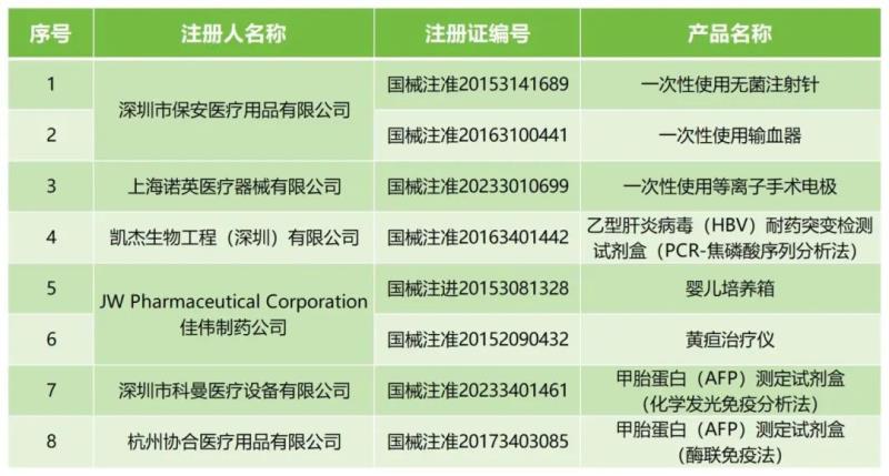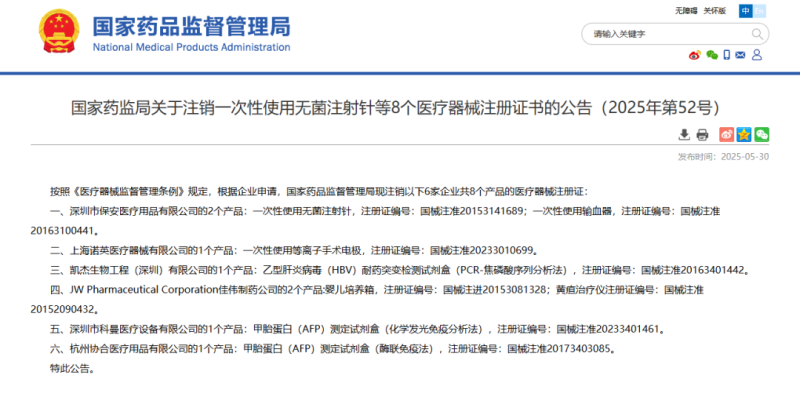 近日,國(guó)家藥監(jiān)局發(fā)布一則醫(yī)療器械注冊(cè)證注銷公告,公告顯示,該局已依法注銷深圳市保安醫(yī)療用品有限公司、深圳市科曼醫(yī)療設(shè)備有限公司等6家企業(yè)共計(jì)8個(gè)產(chǎn)品的醫(yī)療器械注冊(cè)證,包括一次性使用無(wú)菌注射針、一次性使用等離子手術(shù)電極、黃疸治療儀等產(chǎn)品,具體如下: