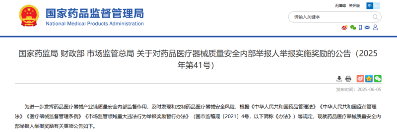 6月5日,國家藥監(jiān)局發(fā)布《關(guān)于對藥品醫(yī)療器械質(zhì)量安全內(nèi)部舉報人舉報實施獎勵的公告(2025年第41號)》(以下簡稱《公告》),以進(jìn)一步鼓勵內(nèi)部舉報人舉報藥品醫(yī)療器械質(zhì)量安全問題,推動藥品醫(yī)療器械質(zhì)量安全社會共治、防范遏制藥品醫(yī)療器械領(lǐng)域重大違法行為?!豆妗啡娜缦拢?/span>