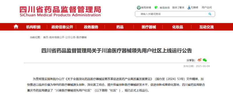 該社區(qū)平臺的開發(fā)上線是落實國務(wù)院辦公廳《關(guān)于全面深化藥品醫(yī)療器械監(jiān)管改革促進醫(yī)藥產(chǎn)業(yè)高質(zhì)量發(fā)展意見》(國辦發(fā)〔2024〕53號)文件精神的重要舉措。四川省藥監(jiān)局相關(guān)負責(zé)人表示,今后將持續(xù)拓展優(yōu)化社區(qū)平臺功能,逐步擴大行業(yè)用戶覆蓋面,進一步整合省內(nèi)臨床和醫(yī)療器械研發(fā)資源,為醫(yī)療器械創(chuàng)新研發(fā)提供全方位、全過程的服務(wù)支撐,助力臨床研究成果轉(zhuǎn)化,營造良好醫(yī)療器械創(chuàng)新生態(tài)。