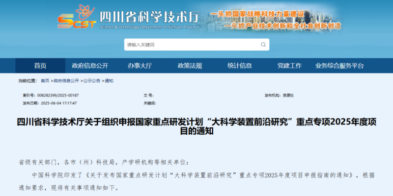 近日,四川省科學(xué)技術(shù)廳發(fā)布《關(guān)于組織申報(bào)國(guó)家重點(diǎn)研發(fā)計(jì)劃“大科學(xué)裝置前沿研究”重點(diǎn)專(zhuān)項(xiàng)2025年度項(xiàng)目的通知》,具體事項(xiàng)如下: