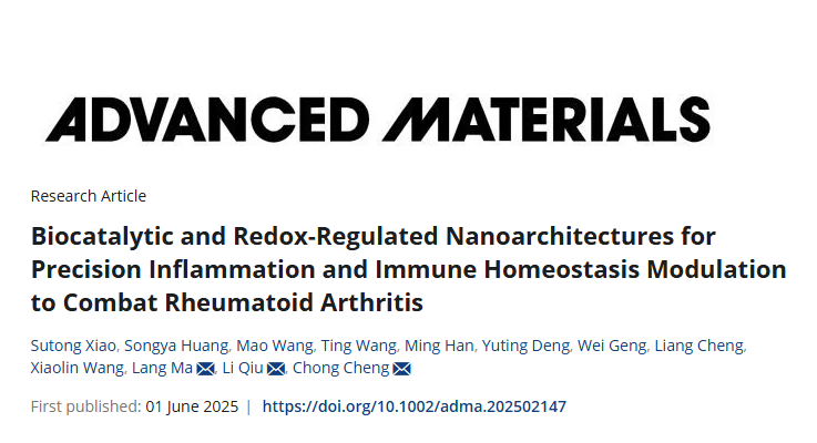 基于背景提及的問題,四川大學(xué)程沖教授、四川大學(xué)華西醫(yī)院邱邐教授等人合成了生物催化和氧化還原調(diào)控納米結(jié)構(gòu),用于精確調(diào)節(jié)炎癥和免疫平衡以防治類風(fēng)濕性關(guān)節(jié)炎。相關(guān)成就Biocatalytic and Redox-Regulated Nanoarchitectures for Precision Inflammation and Immune Homeostasis Modulation to Combat Rheumatoid Arthritis為題發(fā)表在 Advanced Materials。我們將該文獻(xiàn)部分內(nèi)容轉(zhuǎn)載如下,以供相關(guān)企業(yè)學(xué)習(xí)參考。