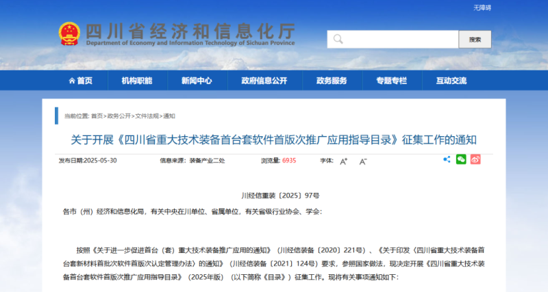 近日,四川省經(jīng)濟(jì)和信息化廳發(fā)布《關(guān)于開(kāi)展〈四川省重大技術(shù)裝備首臺(tái)套軟件首版次推廣應(yīng)用指導(dǎo)目錄〉征集工作的通知》(以下簡(jiǎn)稱《通知》),其中提到,申請(qǐng)列入《四川省重大技術(shù)裝備首臺(tái)套軟件首版次推廣應(yīng)用指導(dǎo)目錄(2025版)》的重大技術(shù)裝備產(chǎn)品應(yīng)能夠支撐打造現(xiàn)代產(chǎn)業(yè)體系、建設(shè)國(guó)家戰(zhàn)略腹地,重點(diǎn)聚焦人工智能、低空經(jīng)濟(jì)、航空航天、新能源、高端能源裝備、新能源汽車(chē)及動(dòng)力電池等重點(diǎn)產(chǎn)業(yè)鏈領(lǐng)域,工業(yè)母機(jī)、軌道交通裝備等領(lǐng)先領(lǐng)域,行業(yè)專用裝備等優(yōu)勢(shì)領(lǐng)域,先進(jìn)核技術(shù)應(yīng)用裝備、未來(lái)交通裝備、深空深地裝備等新興和未來(lái)領(lǐng)域,以及重大工程施工裝備、農(nóng)機(jī)裝備、應(yīng)急裝備、醫(yī)療裝備、民生裝備等領(lǐng)域。
