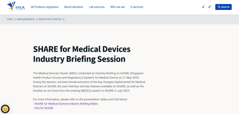 近日,新加坡HSA發(fā)布了有關(guān)醫(yī)療器械注冊提交新系統(tǒng)SHARE(Singapore Health Product Access and Regulatory E-System)的公告,介紹了SHARE與原有MEDICS系統(tǒng)相比的一些關(guān)鍵變化、SHARE上可用的用戶界面和主要功能,同時(shí)給出了有關(guān)SHARE逐步推進(jìn)使用的關(guān)鍵時(shí)間線。