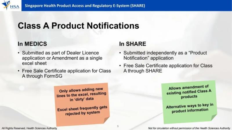 ↑ 在MEDICS系統(tǒng)中,A類產(chǎn)品通知作為經(jīng)銷商許可證申請或變更的組成部分,通過單一Excel表格提交,產(chǎn)品自由銷售證書需通過FormSG申請;而在SHARE中,A類產(chǎn)品通知作為獨(dú)立的“產(chǎn)品通知”申請?zhí)峤?,產(chǎn)品自由銷售證書可直接通過SHARE申請。