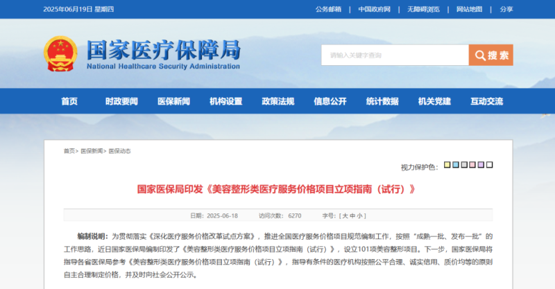 6月18日,國家醫(yī)保局印發(fā)了《美容整形類醫(yī)療服務(wù)價格項(xiàng)目立項(xiàng)指南(試行)》(以下簡稱《指南》),共規(guī)定了101項(xiàng)美容整形項(xiàng)目的服務(wù)價格相關(guān)內(nèi)容,包括價格構(gòu)成、計價單位等,如光/激光美容治療費(fèi)的計價單位為光斑,射頻、超聲、微針等美容治療費(fèi)的計價單位均為平方厘米……