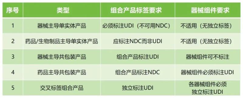 該草案提到,如21 CFR第3部分所述,組合產(chǎn)品由兩種或兩種以上不同類型的產(chǎn)品組成(即藥物、器械和/或生物制品的組合。在組合產(chǎn)品中所包含的每種藥物、器械和生物制品都被稱為該組合產(chǎn)品的組成部分。一般包括單一實體組合產(chǎn)品、共包裝組合產(chǎn)品交叉標簽組合產(chǎn)品等,相應的UDI要求如下: