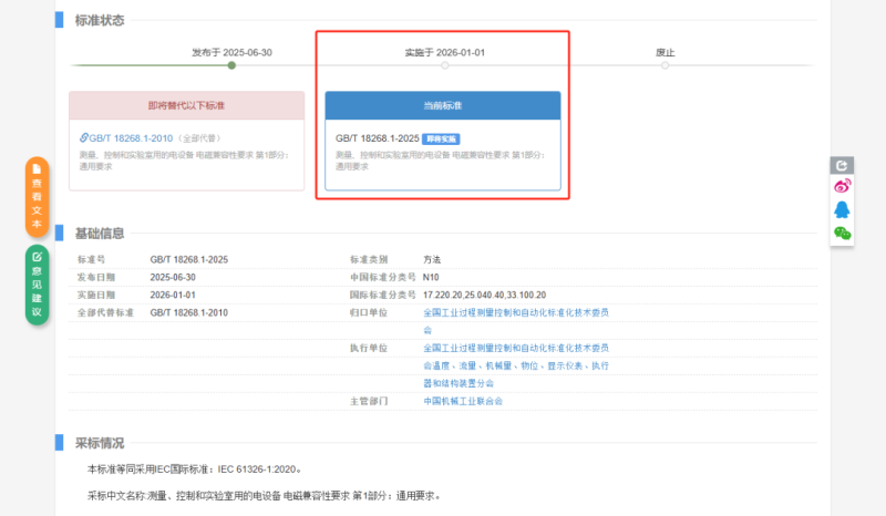 據(jù)全國標準信息公共服務平臺近日公布,GB/T 18268.1-2025《測量、控制和實驗室用的電設備 電磁兼容性要求 第1部分:通用要求》推薦性國家標準批準發(fā)布,該標準即將替代GB/T 18268.1-2010,于2026年1月1日起正式實施。據(jù)悉,該標準等同采用IEC國際標準:IEC 61326-1:2020。